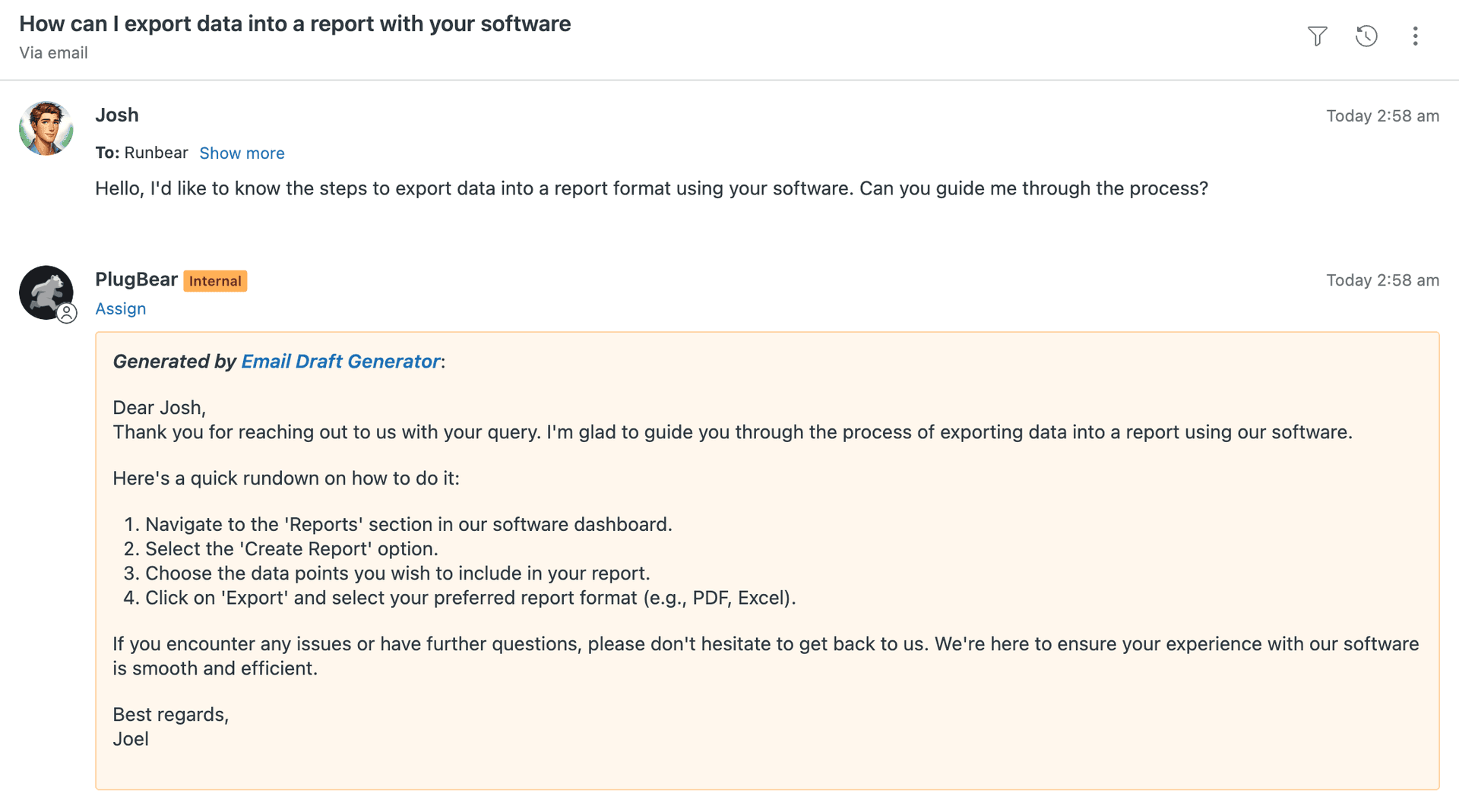 Automated Email Drafts: Automatically generates email drafts based on Zendesk tickets, tailored to the customer's inquiry. This saves CS agents valuable time and enhances customer interaction quality.