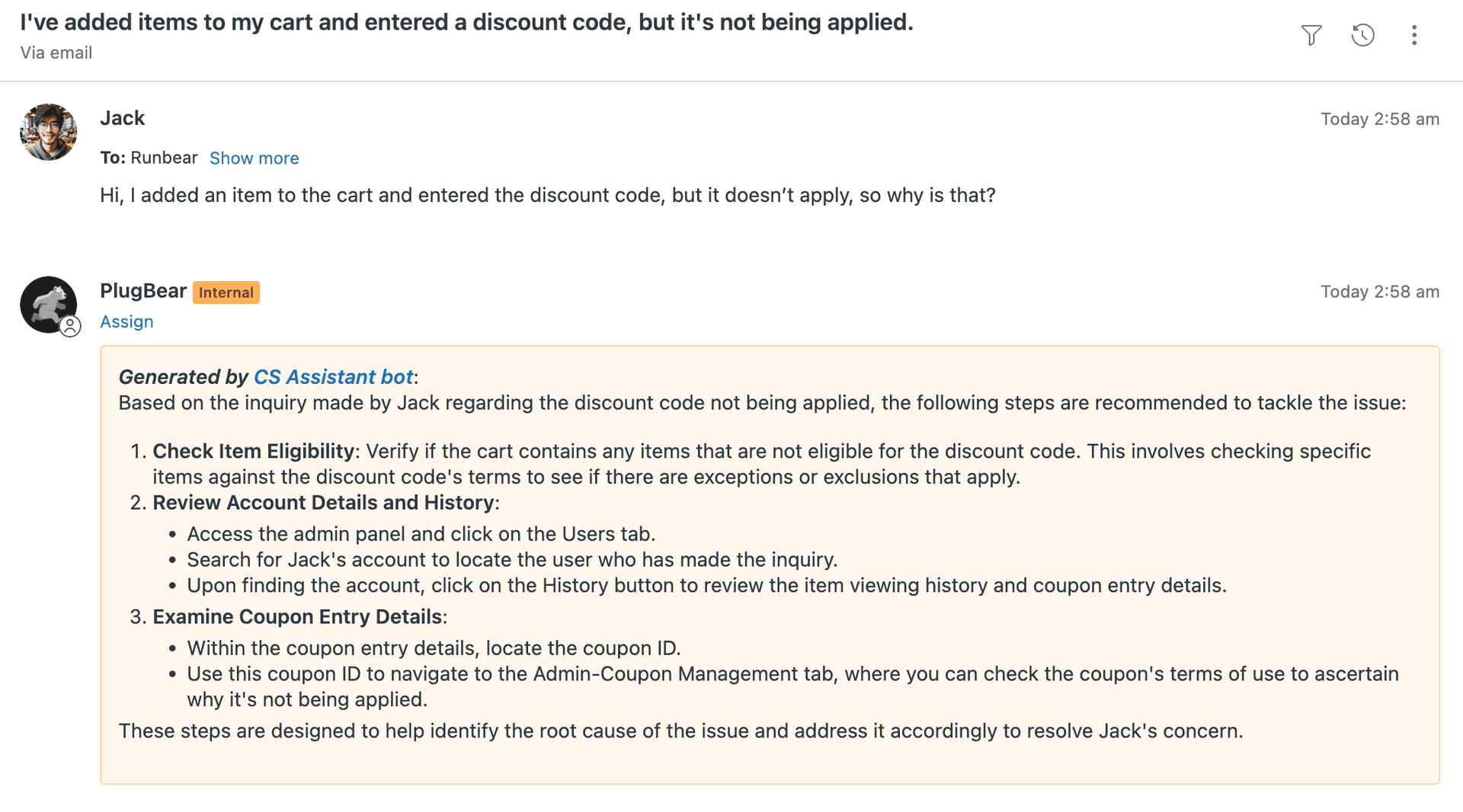 Inquiry Resolution Guide: Upon ticket creation, Runbear utilizes the knowledge base to perform preliminary investigations, offering insights and potential solutions to agents. This approach enables agents to quickly identify potential resolutions and enhance their response to customer inquiries.