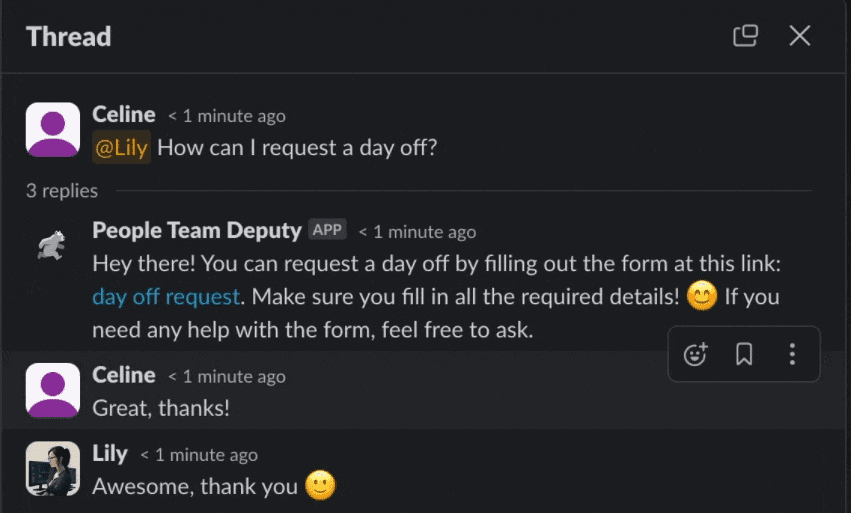 You can create a bot for Slack that can answer questions on your behalf. People can still ask questions the same way they always have – by mentioning you or your team.