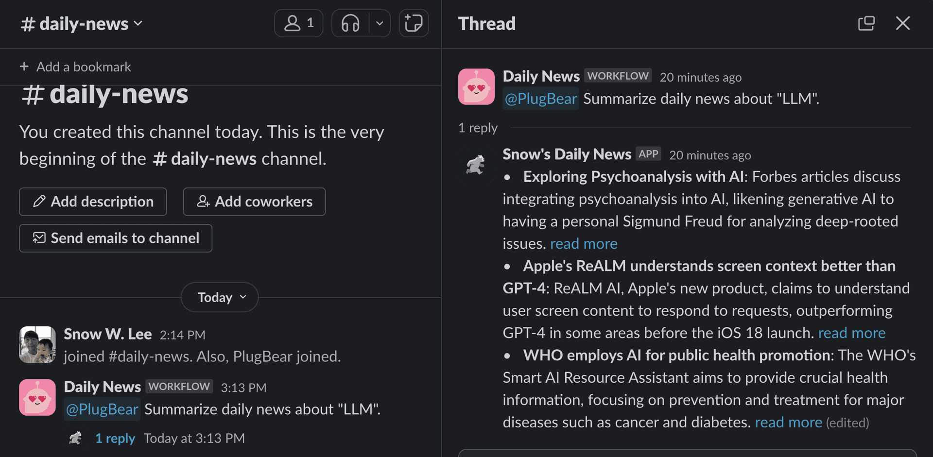 Create a personalized bot that summarizes daily news on your chosen topics, delivering concise and relevant updates directly to your communication channels like Slack or Microsoft Teams. Check our blog post to learn more!