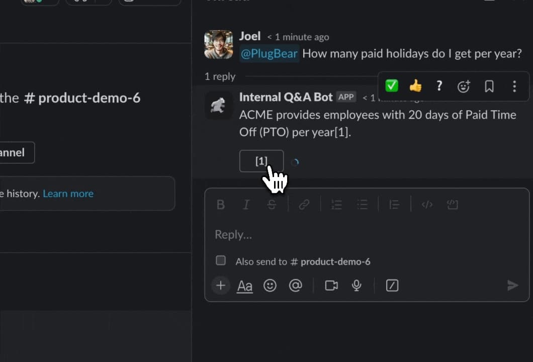 Our latest update introduces annotation capabilities for responses generated by the LLM App within Slack. This promotes transparency by allowing users to easily reference and verify the original source or document related to the app's responses.