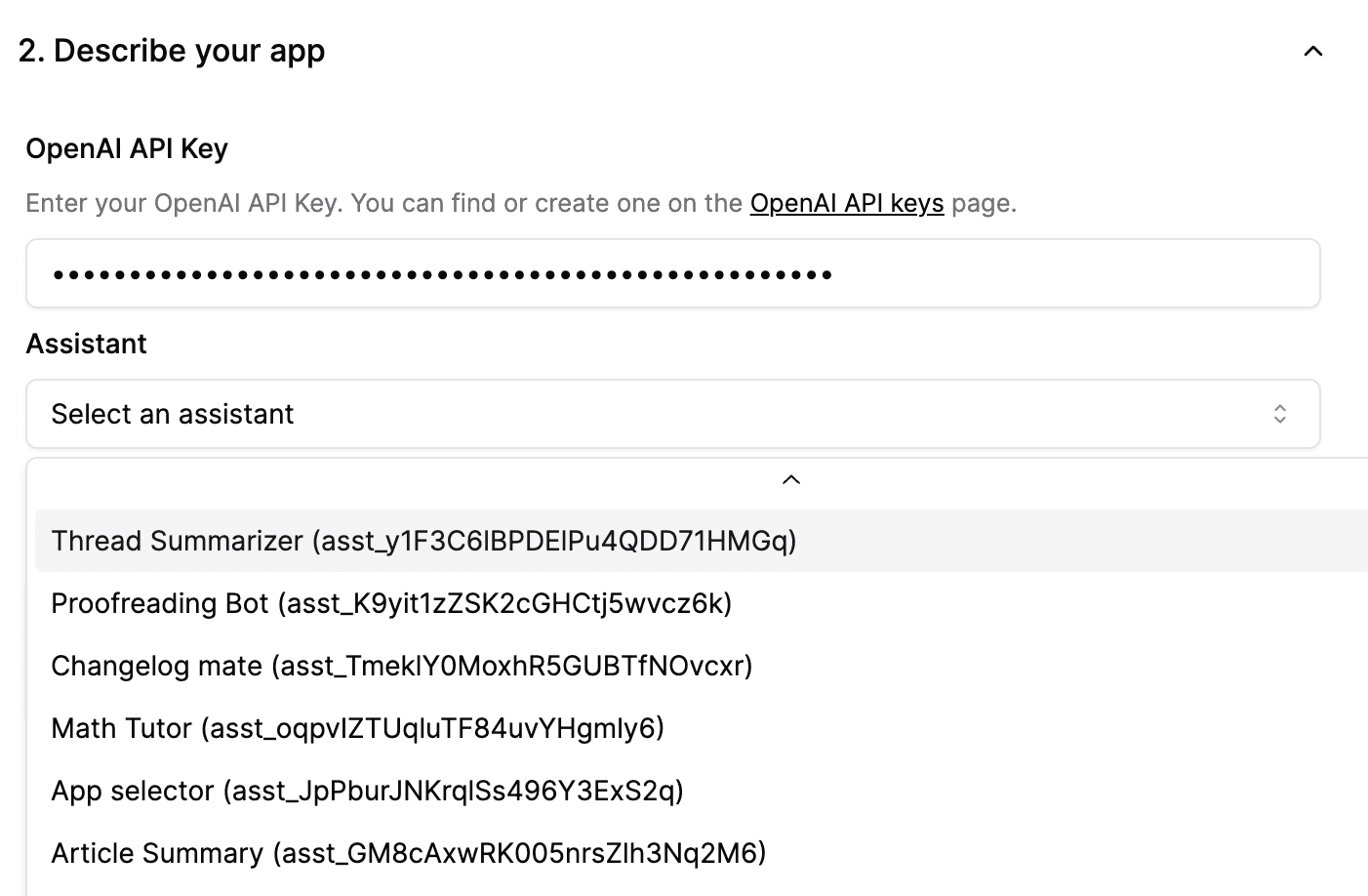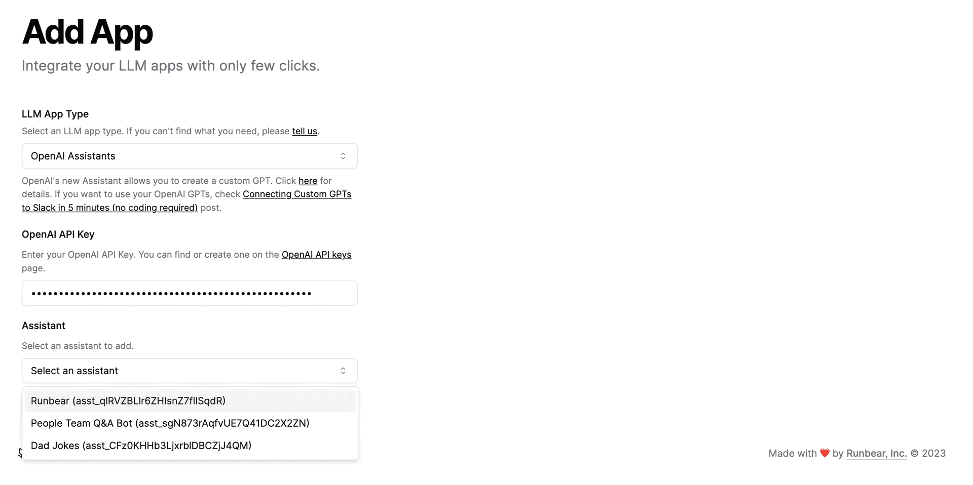 Return to Runbear, visit Assistants page and click the Add assistant button. Select OpenAI Assistants import option and paste your OpenAI Assistant API key.