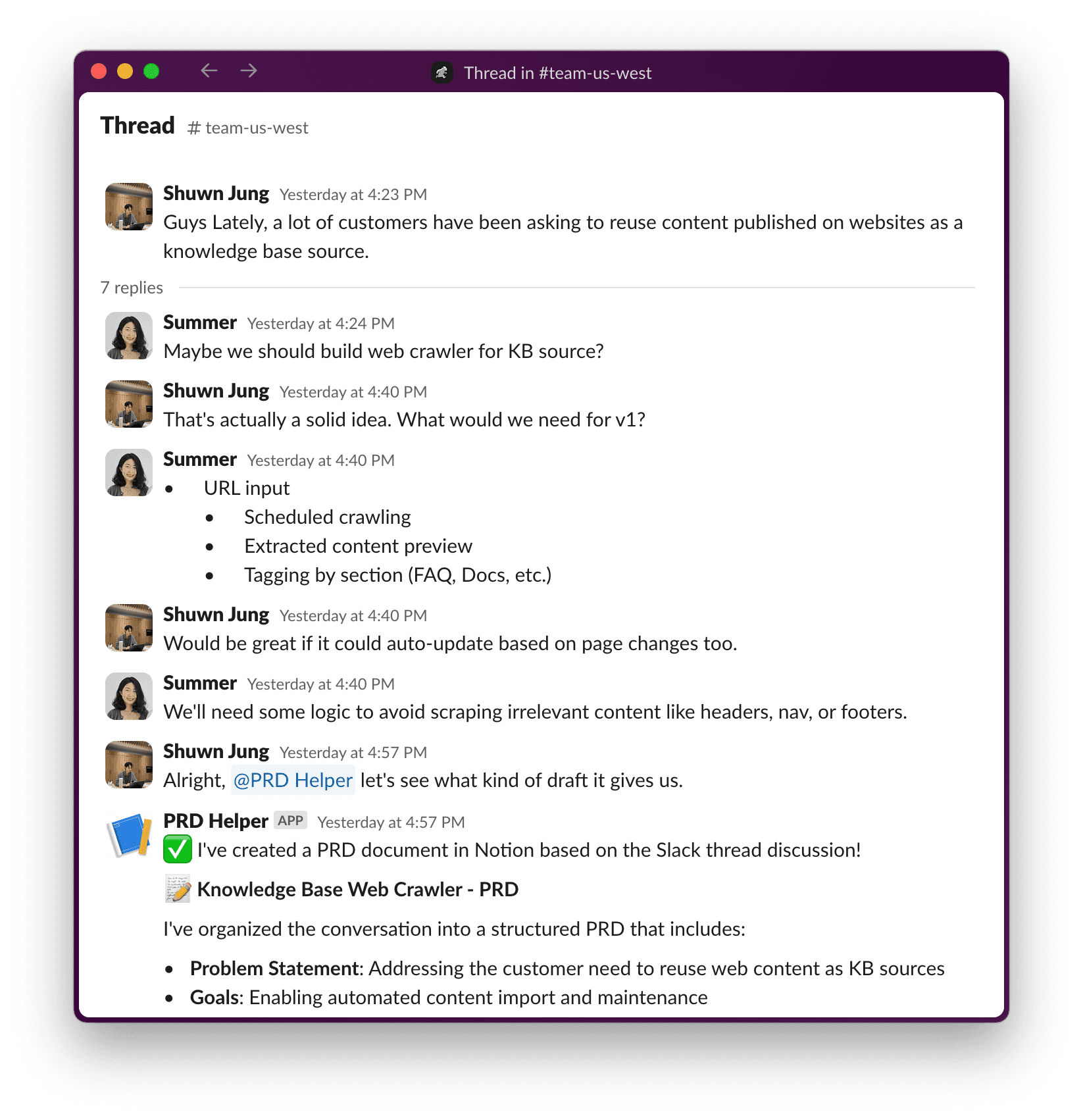 Our PRD Helper bot lets you turn any Slack thread into a structured PRD document—automatically generated and saved to your Notion workspace.