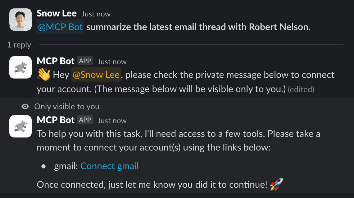 Each Slack user connects their own account. When a user requests something that requires authorization, the Slack bot will prompt them with a secure link to connect.