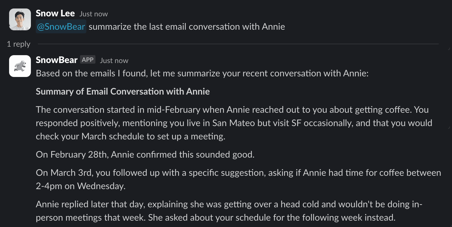 Ask your AI assistant to analyze long email threads and deliver concise summaries right in your Slack channel.