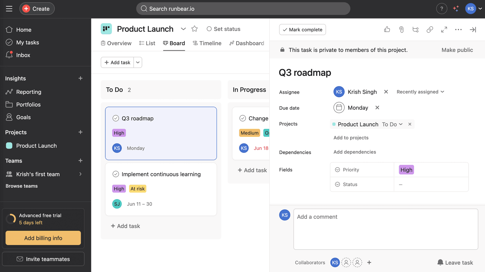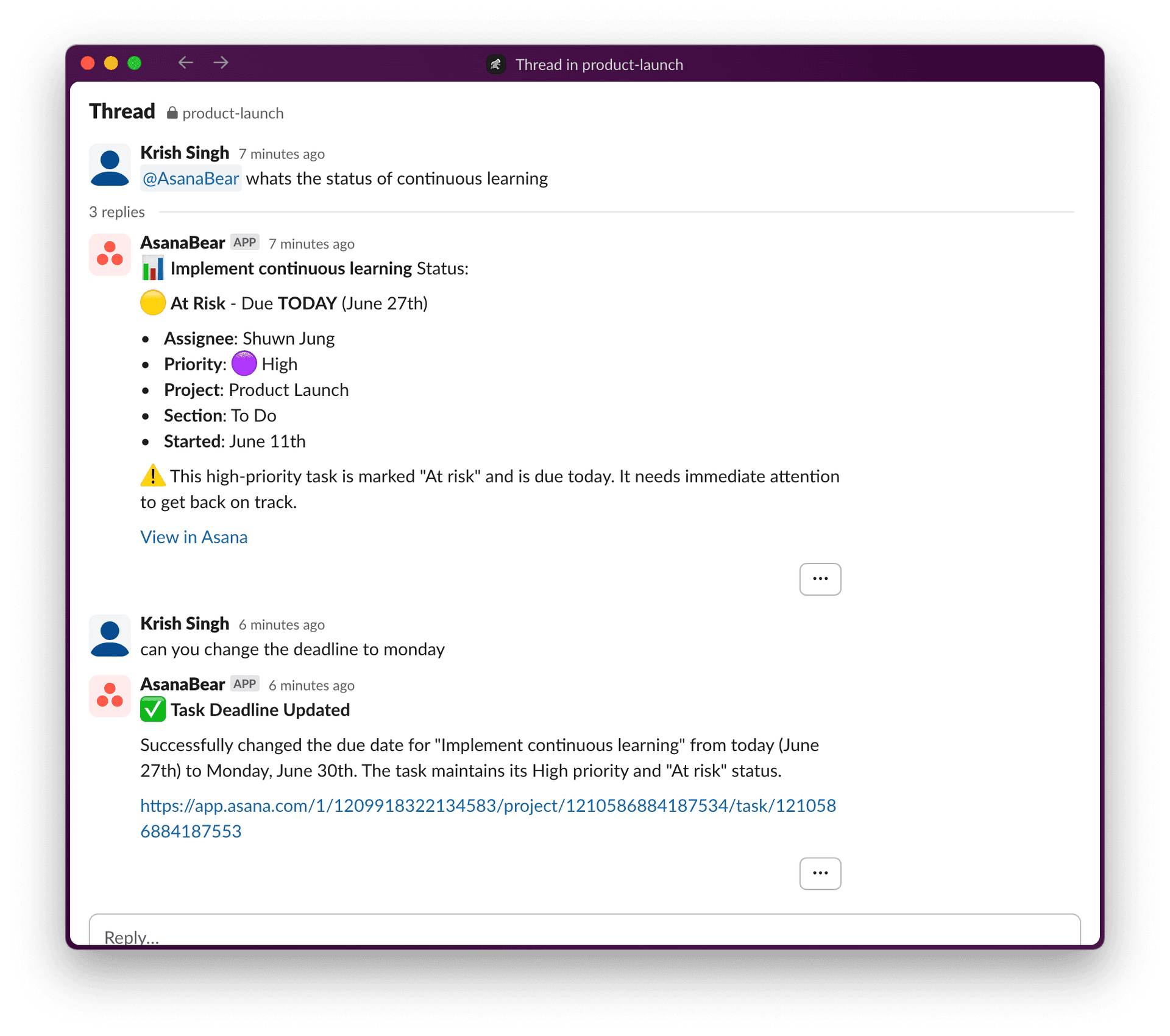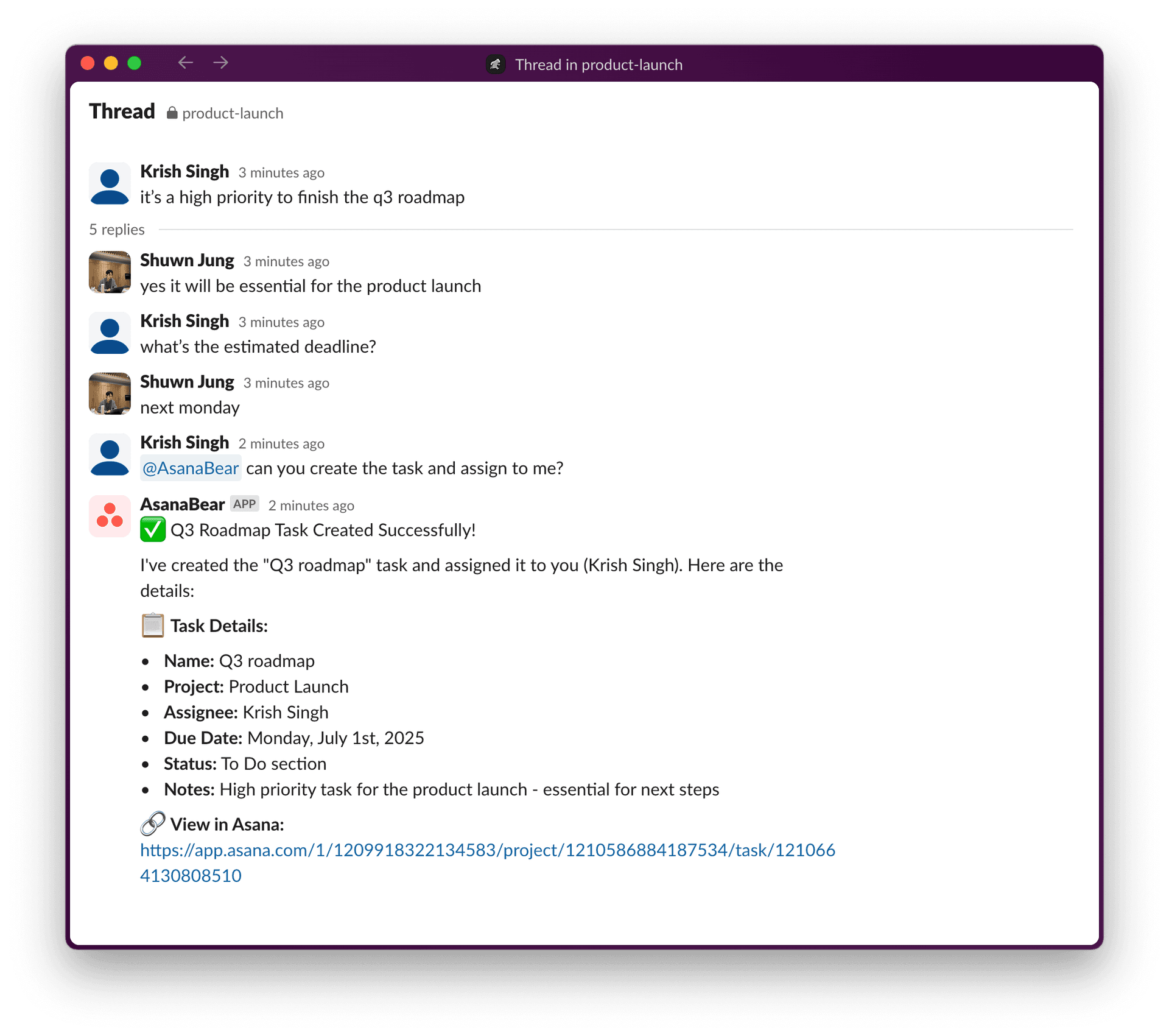 Not anymore. With Runbear’s Asana Slack integration, all this can be done by an AI helper. Break free of task management and focus on getting the job done. From creating new assignments to checking project progress, everything is done in Slack - where conversations already happen.