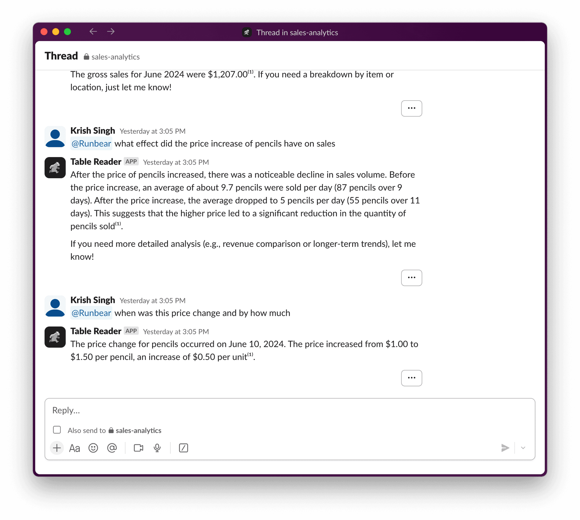 - Runbear analyzes the data and responds quickly with clear, actionable insights